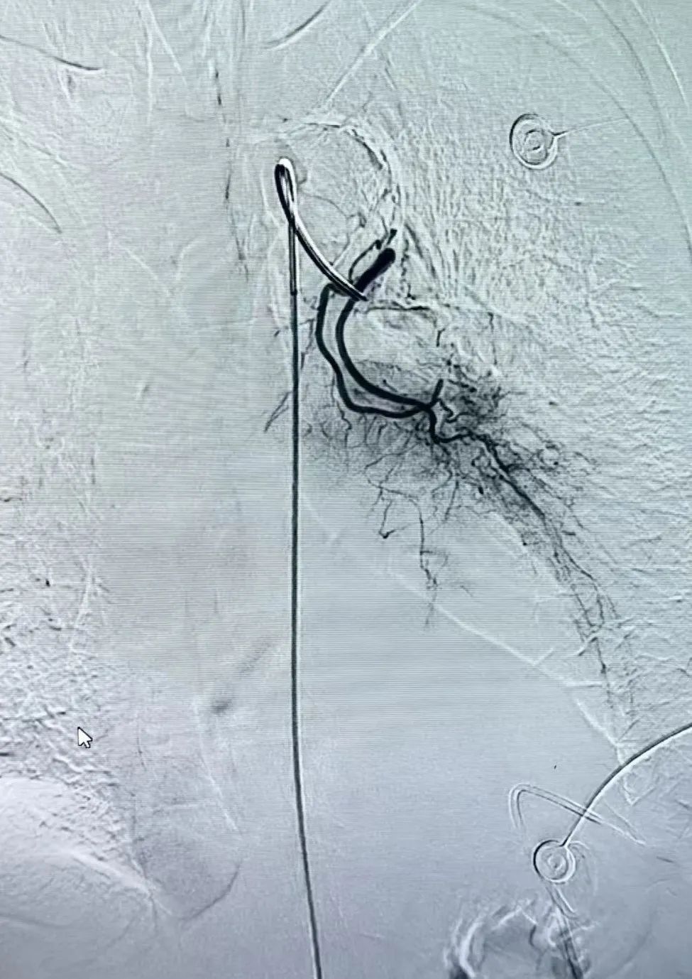 患者王大爷确诊肺恶性肿瘤3月,因无法耐受传统放化疗副作用,治疗效果受限。今年7月复查显示肿瘤增大,伴肺不张、胸腔积液,呼吸功能受损。医院肿瘤科介入团队经多学科会诊评估,在为患者实施胸腔积液置管术的同时,决定采用支气管动脉化疗栓塞术。